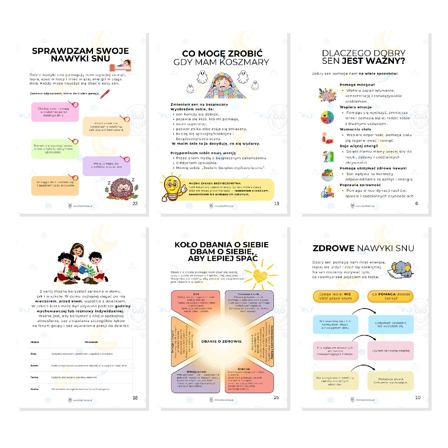 „Zdrowy sen dziecka” to zeszyt ćwiczeń, który wspiera dzieci w zrozumieniu, dlaczego sen jest ważny i jak mogą krok po kroku dbać o spokojny odpoczynek. Materiał pomaga porządkować wieczorne nawyki, wprowadzać rutyny oraz uczyć prostych strategii wyciszania i samoregulacji. Zawiera 43 strony kart pracy, psychoedukacji i ćwiczeń dotyczących higieny snu, lęku przed snem, koszmarów, stresu oraz dbania o siebie. Został stworzony z myślą o nauczycielach, pedagogach, psychologach szkolnych oraz rodzicach pracujących z dziećmi w wieku szkolnym. To praktyczne narzędzie do pracy indywidualnej i grupowej, które wzmacnia poczucie bezpieczeństwa i sprawczości dziecka w codziennym rytmie snu.